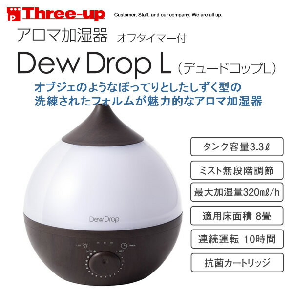 Three Up HFT-1717 スリーアップ 超音波加湿器 Dew Drop L(デュードロップL) オフタイマー付き 【製品仕様】 品番 HFT-1717 [HFT1717] オフタイマー付き 加湿方式:超音波式 サイズ 直径23.5×高さ25.4 cm 質量 1000g 消費電力 25W コード長 1.5m タンク容量 3.3L 最大加湿量 320ml/h 適用床面積 (目安) 〜8畳  連続運転時間(ミスト最大時):10時間 付属品 抗菌カートリッジ、アロマパッド×3枚 メーカー保証期間 1年間 特徴 オブジェのような大粒の雫でアロマの香りを部屋中に オブジェのようなぽってりとしたしずく型の洗練されたフィルムが魅力的なアロマ加湿器「デュードロップ」。