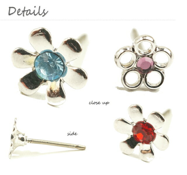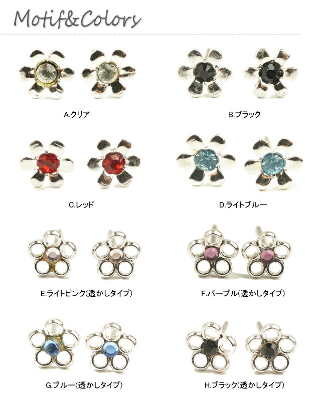 Item Spec 素材 ガラスストーン 合金(ロジウムメッキ) チタンポスト サイズ ◆モチーフのサイズ:直径約6.5mm、透かしタイプ直径約5.5mm ◆ポストの長さ:約10mm 個数 ペアー売り(1組2個セット)耳にやさしいシリコンゴムキャッチ付き 特徴 ころんとしたフォルムがキュートなお花モチーフのピアスです。